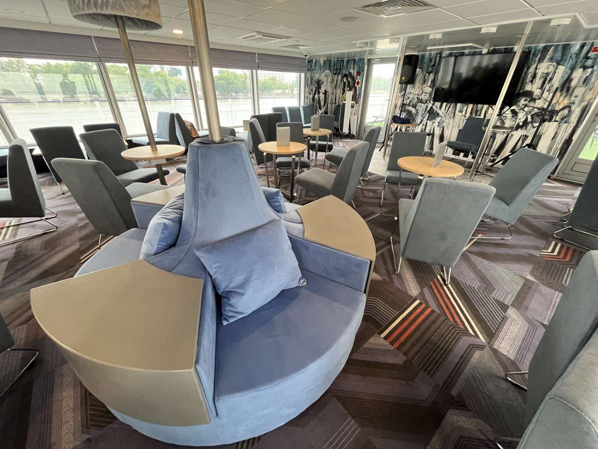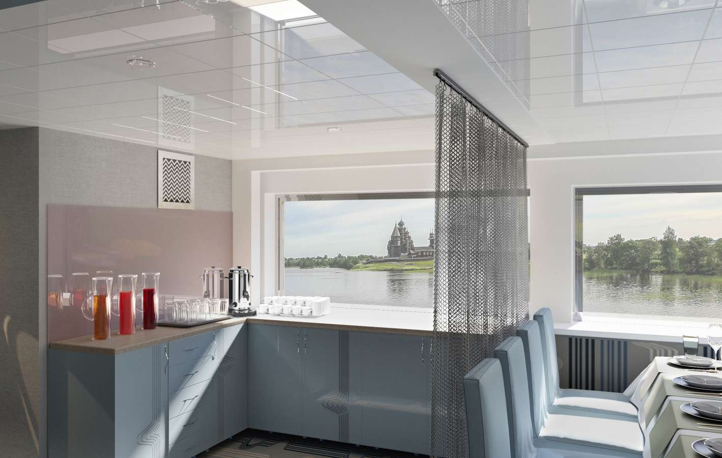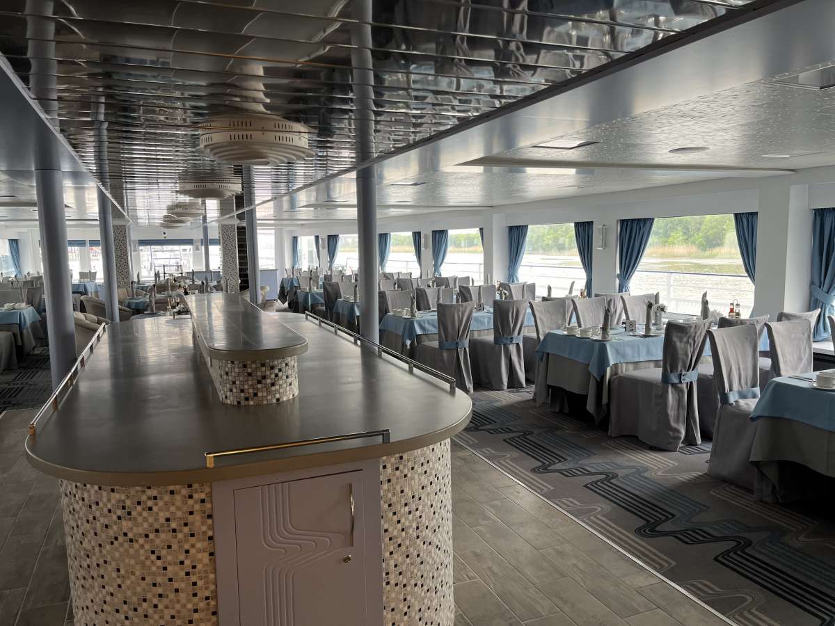 Сравнительно небольшие размеры теплохода позволяют чувствовать себя как дома: будь то ресторан с незабываемым панорамным видом, просторный лаундж-бар, где каждый день звучит живая музыка, прогулочная палуба или небольшой сувенирный киоск с широким ассортиментом товаров.