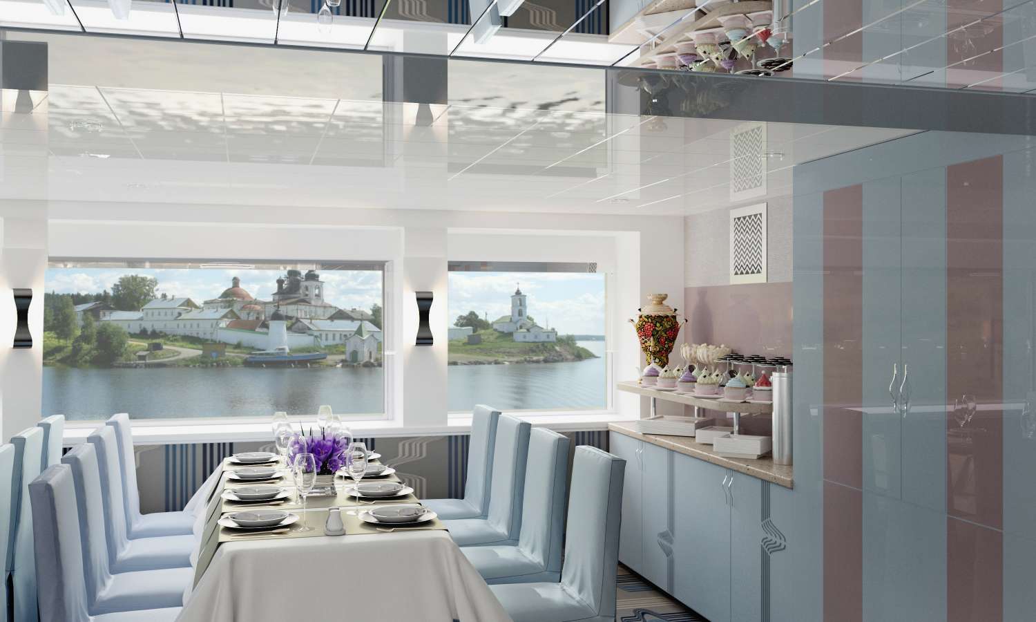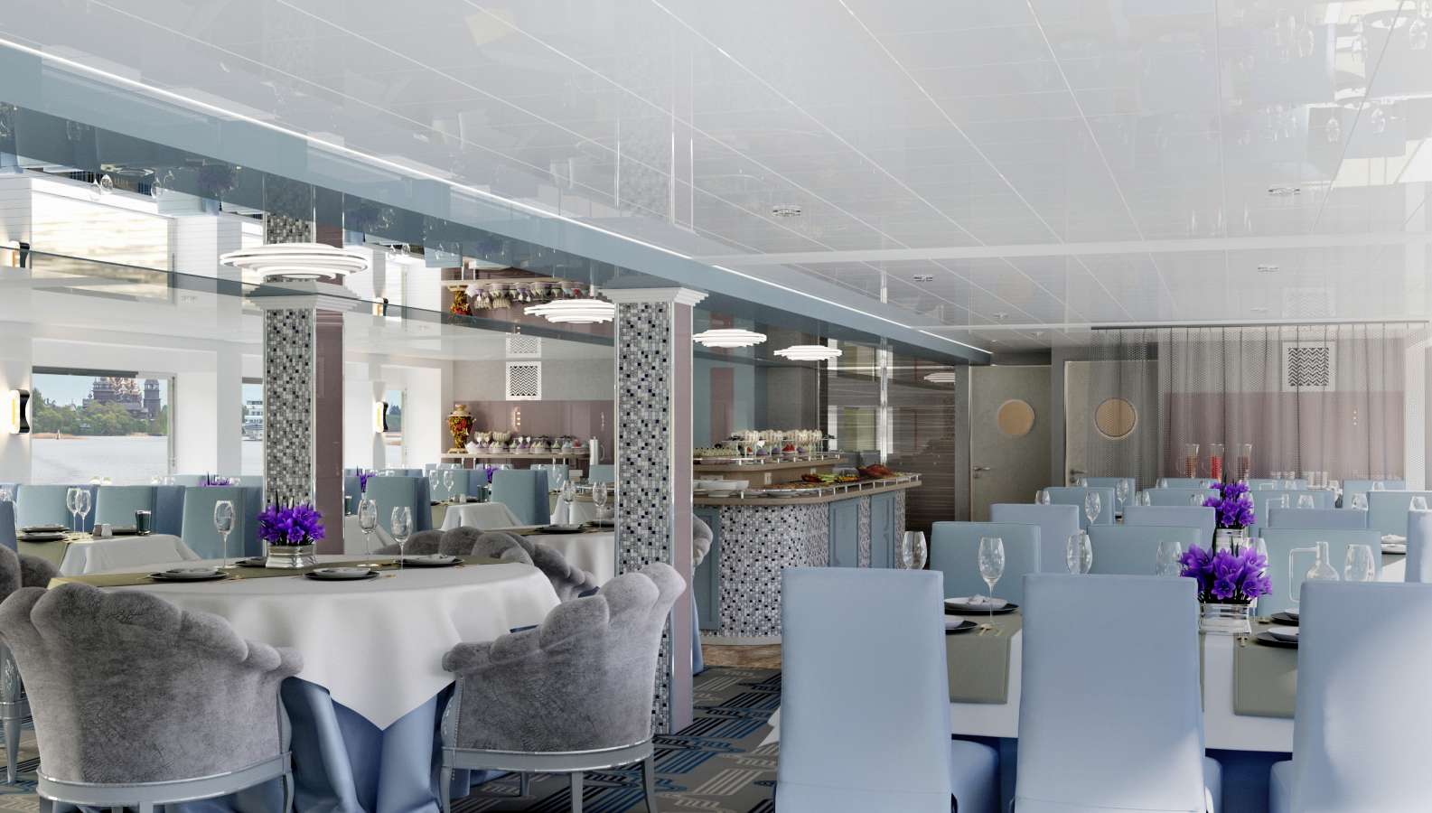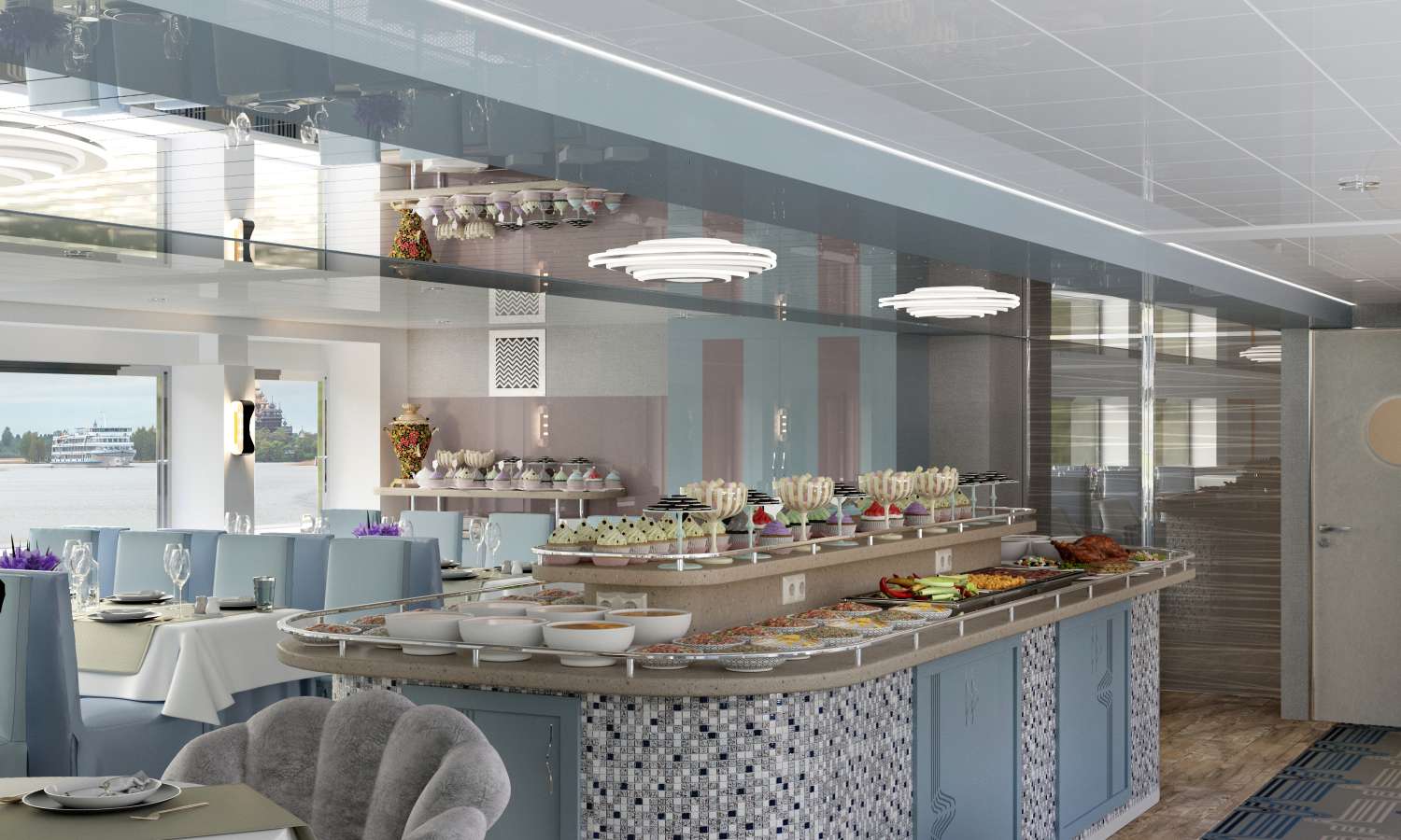 Питание проходит в ресторане в одну смену. Завтрак по системе «шведский стол», обед и ужин – по заказной системе. На борту теплохода работает кофе станция, расположенная на главной палубе.Трехразовое сбалансированное питание с возможностью выбора вегетарианских и низкокалорийных блюд включено в стоимость круиза: