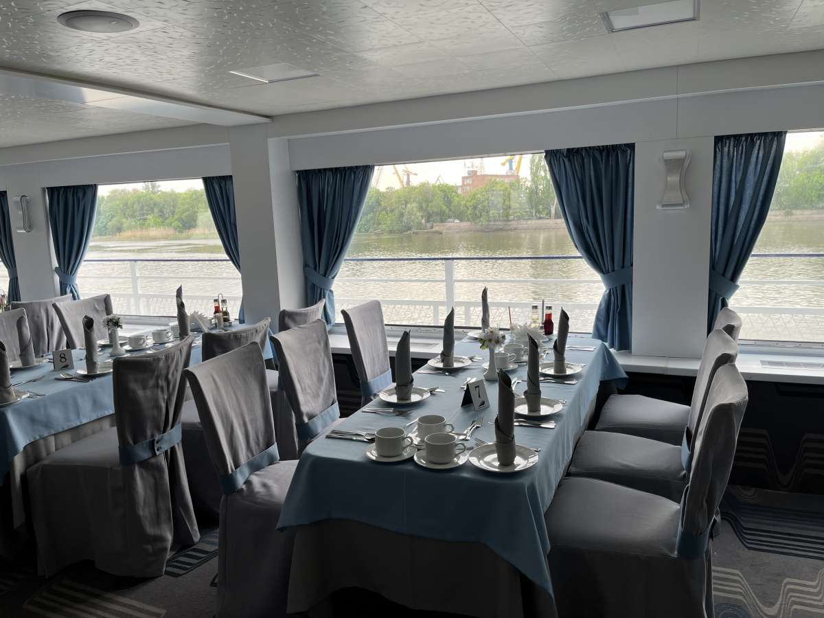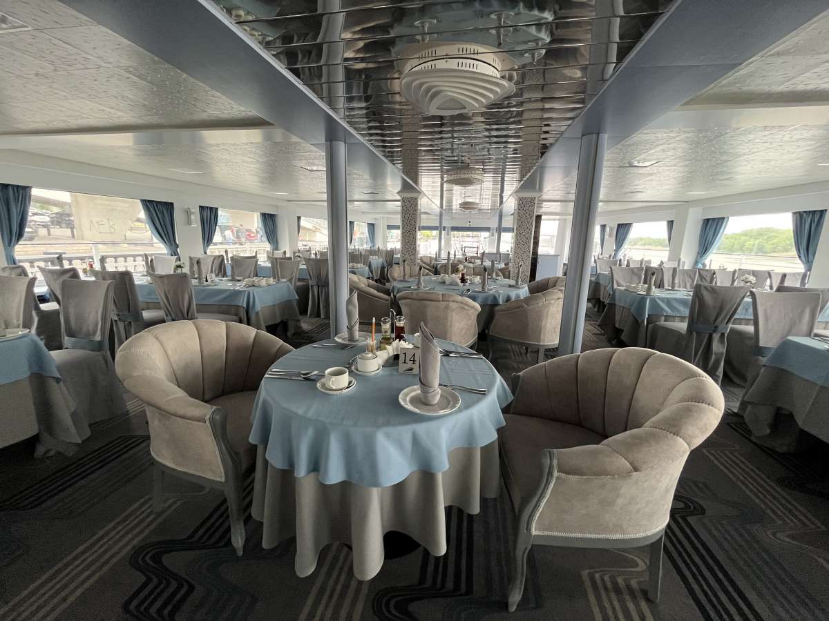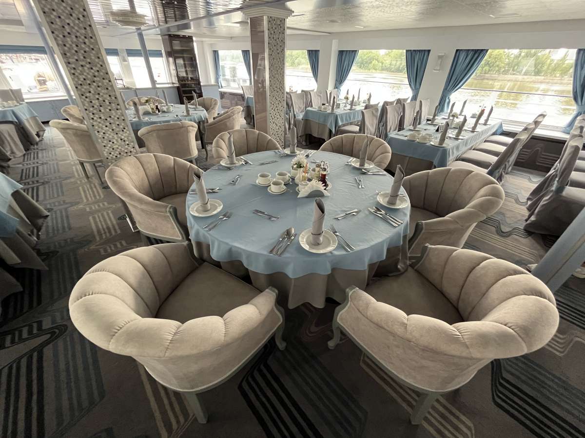 Питание проходит в ресторане в одну смену. Завтрак по системе «шведский стол», обед и ужин – по заказной системе. На борту теплохода работает кофе станция, расположенная на главной палубе.Трехразовое сбалансированное питание с возможностью выбора вегетарианских и низкокалорийных блюд включено в стоимость круиза: