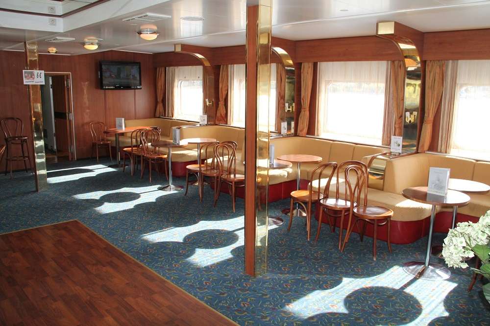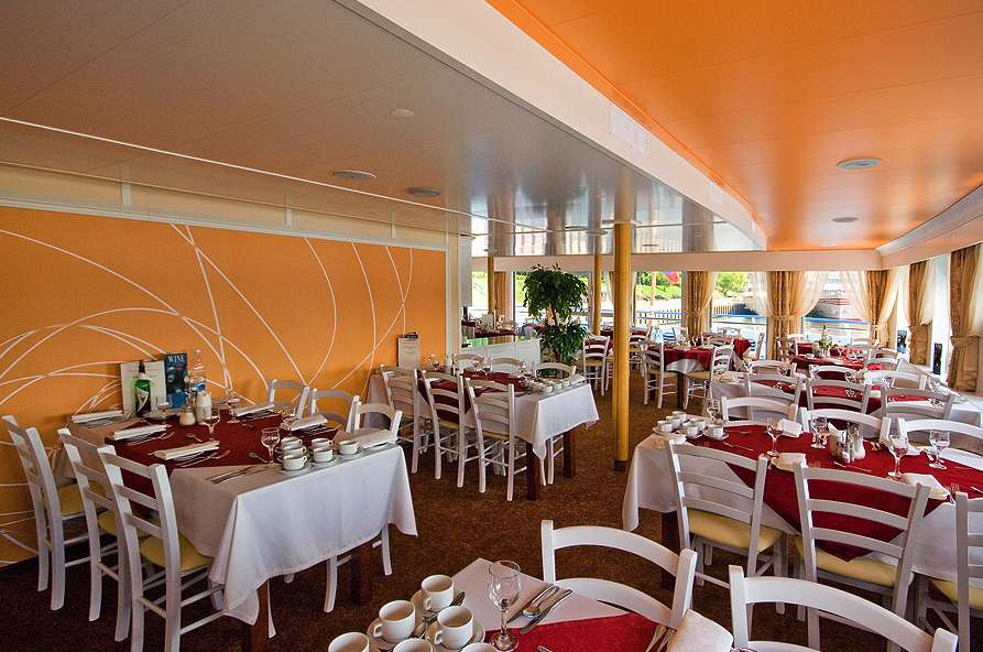 Туристов приятно удивит высокий уровень сервиса в ресторане и барах. В стоимость круизов теплохода включено трехразовое питание: завтрак — по системе шведского стола, обед и ужин — по заказному меню. Возможность выбора вегетарианских и низкокалорийных блюд: