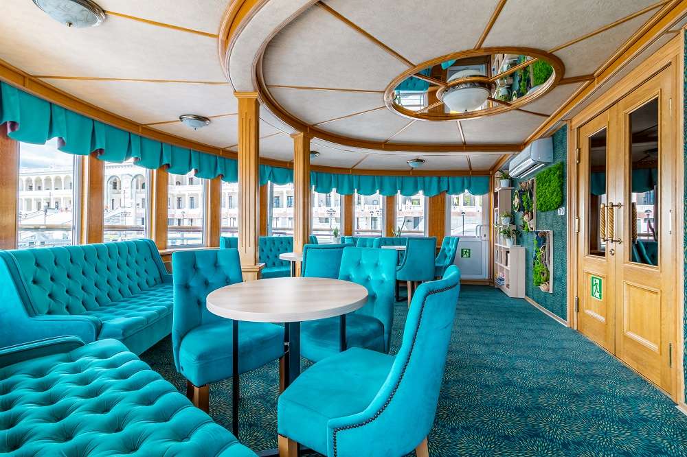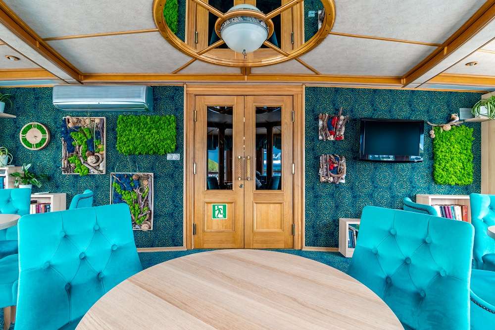 На борту теплохода вы сможете выбрать отдых и развлечения на любой вкус: насладиться речными пейзажами, сидя с книгой в «Лесной гостиной», поиграть в настольные игры, поучаствовать в мастер-классах, музыкальных вечерах, концертных программах, тематических лекциях.